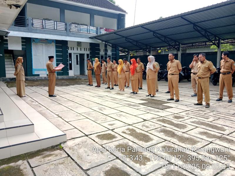 Tanggal 10 November 2025, sebelum bekerja Lurah dan semua Pamong Karangwuni melaksanakan apel terlebih dahulu, apel kali ini dipimpin oleh Bapak Suparta, S.Pd, beliau membacakan Amanat dari Menteri Sosial karena tanggal 10 November adalah Hari Pahlawan. Semoga para pahlawan bisa menjadi teladan kita semua.