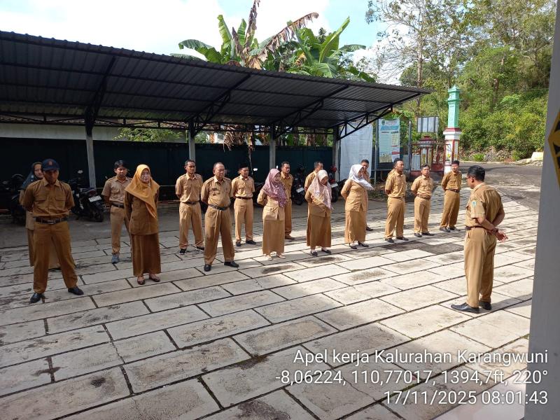 Tanggal 17 November 2025, dilaksanakan apel terlebih dahulu, dalam apel kali ini Bapak Ari Yuli Endarto yang memimpin apel. Beliau berpesan untuk selalu bekerja sesuai regulasi yang ada. Dan beliau juga berpesan untuk selalu mendoakan teman yang sedang sakit, supaya segera bisa bergabung kembali di Balai Kalurahan Karangwuni.