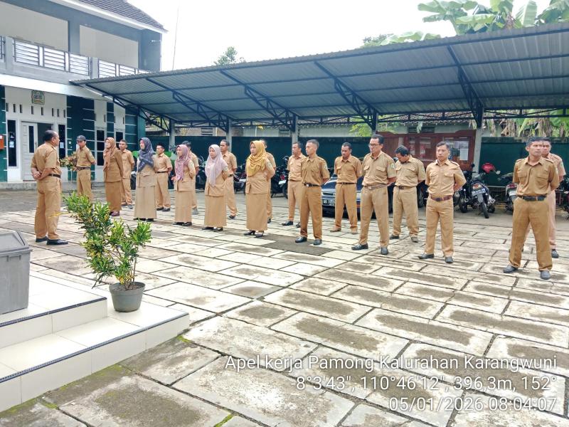 Tanggal 05 Januari 2026, dilaksanakan apel oleh Lurah Karangwuni dan Pamong Kalurahan Karangwuni. Pada apel kali ini dipimpin oleh Bapak Lurah, beliau berpesan untuk selalu mendoakan pada teman yang sedang sakit, dan melupakan segala keburukan ditahun 2025. Semoga tahun 2026 semua lebih baik termasuk cara memberikan pelayanan kepada warga masyarakat.