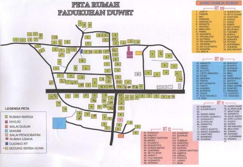 Di dalam peta Padukuhan Duwet memuat beberapa informasi penting, seperti peta rumah warga, lokasi fasilitas umum, serta balai pertemuan padukuhan. Informasi ini sangat bermanfaat dalam berbagai keperluan, misalnya pendataan penduduk, penyaluran bantuan sosial, pelaksanaan kegiatan kemasyarakatan, hingga penanganan keadaan darurat. Pamong padukuhan dan pengurus RT dapat dengan cepat mengetahui lokasi yang dituju tanpa kebingungan.
