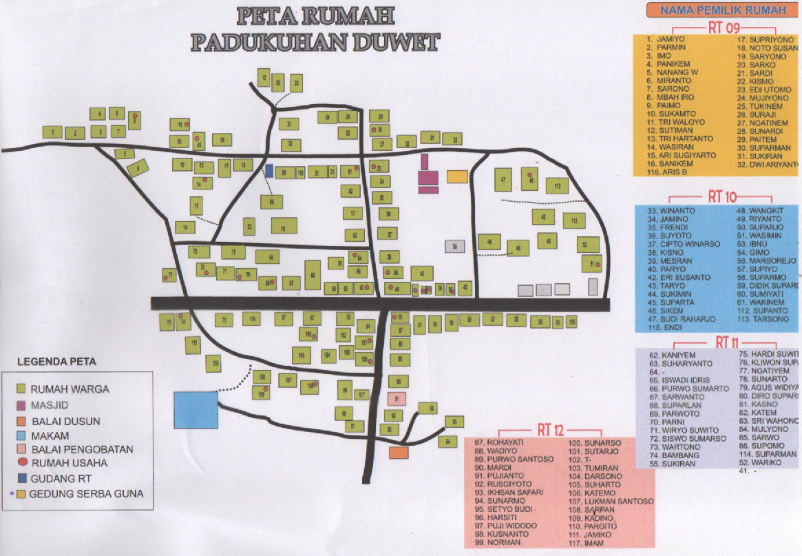 Padukuhan Duwet merupakan salah satu padukuhan yang membutuhkan peta rumah sebagai acuan data wilayah. Padukuhan ini memiliki empat Rukun Tetangga (RT), yaitu RT 9, RT 10, RT 11, dan RT 12. Setiap RT memiliki sebaran rumah dan jumlah warga yang berbeda, sehingga diperlukan peta yang mampu menggambarkan kondisi tersebut secara rinci dan mudah dipahami.