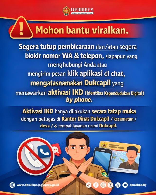 DPMKKPS menegaskan bahwa aktivasi Identitas Kependudukan Digital (IKD) hanya dapat dilakukan secara tatap muka dengan petugas resmi di Dinas Kantor Dukcapil, kantor kapanewon, kantor desa/kalurahan, atau tempat layanan resmi Dukcapil lainnya yang telah ditunjuk oleh DPMKKPS.