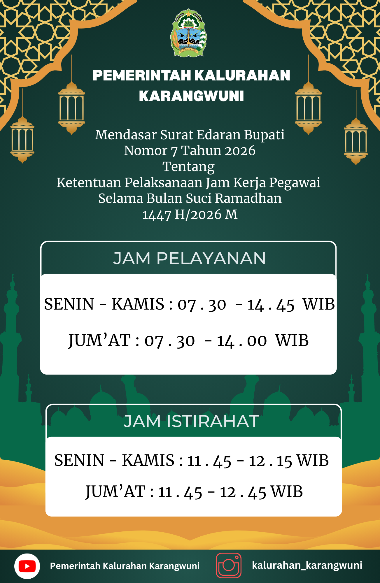 Jam Kerja Pemerintah Kalurahan Karangwuni Selama Bulan Ramadan 1447 H/2026 M