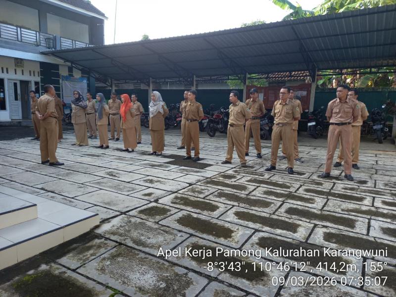 Tanggal 09 Maret 2026, mulai pukul 07.30 WIB, Lurah dan Pamong Kalurahan Karangwuni melaksanakan apel di halaman Balai Kalurahan Karangwuni. Ucapan selamat datang disampaikan oleh Bapak Lurah Karangwuni kepada semua peserta apel. Selain itu beliau juga mengucapkan terimakasih atas partisipasi semuanya dalam safari tarawih Kalurahan Karangwuni disepuluh padukuhan dan semua berjalan lancar.
