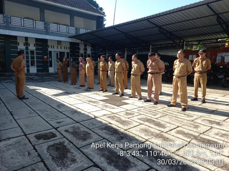Senin, tanggal 30 Maret 2026, Lurah dan semua Pamong di Kalurahan Karangwuni melaksanakan apel terlebih dahulu sebelum bekerja, apel yang dilkasanakan di halaman Balai Kalurahan Karangwuni itu dimulai pukul 08.00 WIB. Pada kesempatan ini pemimpin apel pagi adalah Bapak Ari Yuli Endarto, S.I.P, selaku Carik di Kalurahan Karangwuni. Beliau mengucapkan selamat datang dan terimakasih atas ketertiban dan kehadiran semuanya, semoga hal-hal baik seperti ini selalu bisa dilaksanakan, beliau juga menyampaikan bahwa DD sudah turun bisa dimulai pembanguan jalan di wilayah Padukuhan Sriten, selain itu juga disampaikan bahwa Hari Kamis diminta untuk hadir pada acara Peringatan Hari Jadi DIY ke-271.