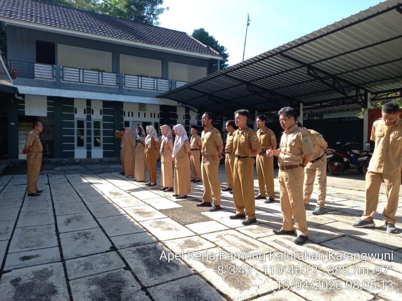 Tanggal 13 April 2026, mulai pukul 08.00 WIB, Lurah, dan Pamong Kalurahan Karangwuni melaksanakan apel terlebih dahulu sebelum bekerja, hal itu rutin dilaksanakan setiap Hari Senin, dan disetiap awal masuk setelah libur panjang. Pada kesempatan ini Bapak Suparta, S.Pd, selaku Lurah di Kalurahan Karangwuni sebagai pembina apel. Beliau menyampaikan ucapan terimakasih atas kedatangan semuanya yang sudah tepat waktu, selain itu beliau juga mengucapkan terimakasih untuk beberapa Dukuh yang sudah menyelesaikan PBB, dan sudah menyetorkan kepada Bapak Jagabaya.