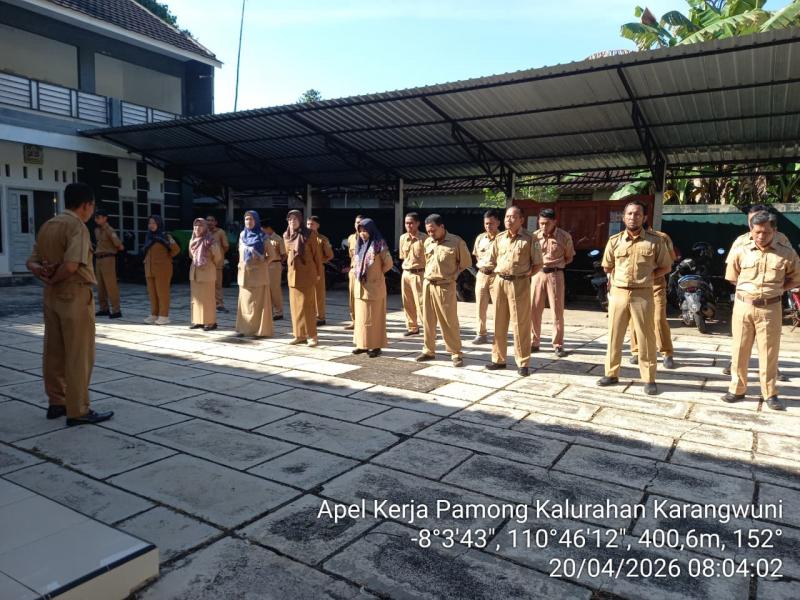 Tanggal 20 April 2026 pagi, mulai pukul 08.00 WIB, Lurah dan Pamong Kalurahan Karangwuni melaksanakan apel pagi. Dalam hal ini Carik Kalurahan Karangwuni beliau Bapak Ari Yuli Endarto, S.I.P, sebagai pembina apel. Beliau menyampaikan ucapan terimakasih atas kehadiran semuanya, dan menghimbau semuanya untuk tetap menjaga kesehatan, mengingat cuaca yang sangat panas ini. Selain itu beliau juga menyampaikan Perubahan APBKal Karangwuni sudah diposting.